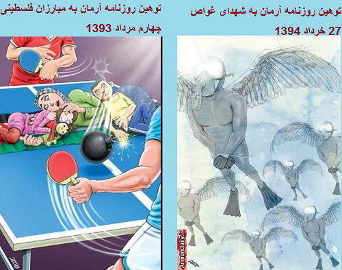 به گزارش نافع به نقل از راه دانا؛ روزنامه آرمان در شماره 2780 روز چهارشنبه 27 خردادماه 94، در ستون "کارتون" خود که همه روزه در صفحه آخر این روزنامه منتشر می شود، طرحی گستاخانه و توهین آمیز نسبت به شهدای بزرگوار و مظلوم غواص کشورمان را چاپ کرد.
